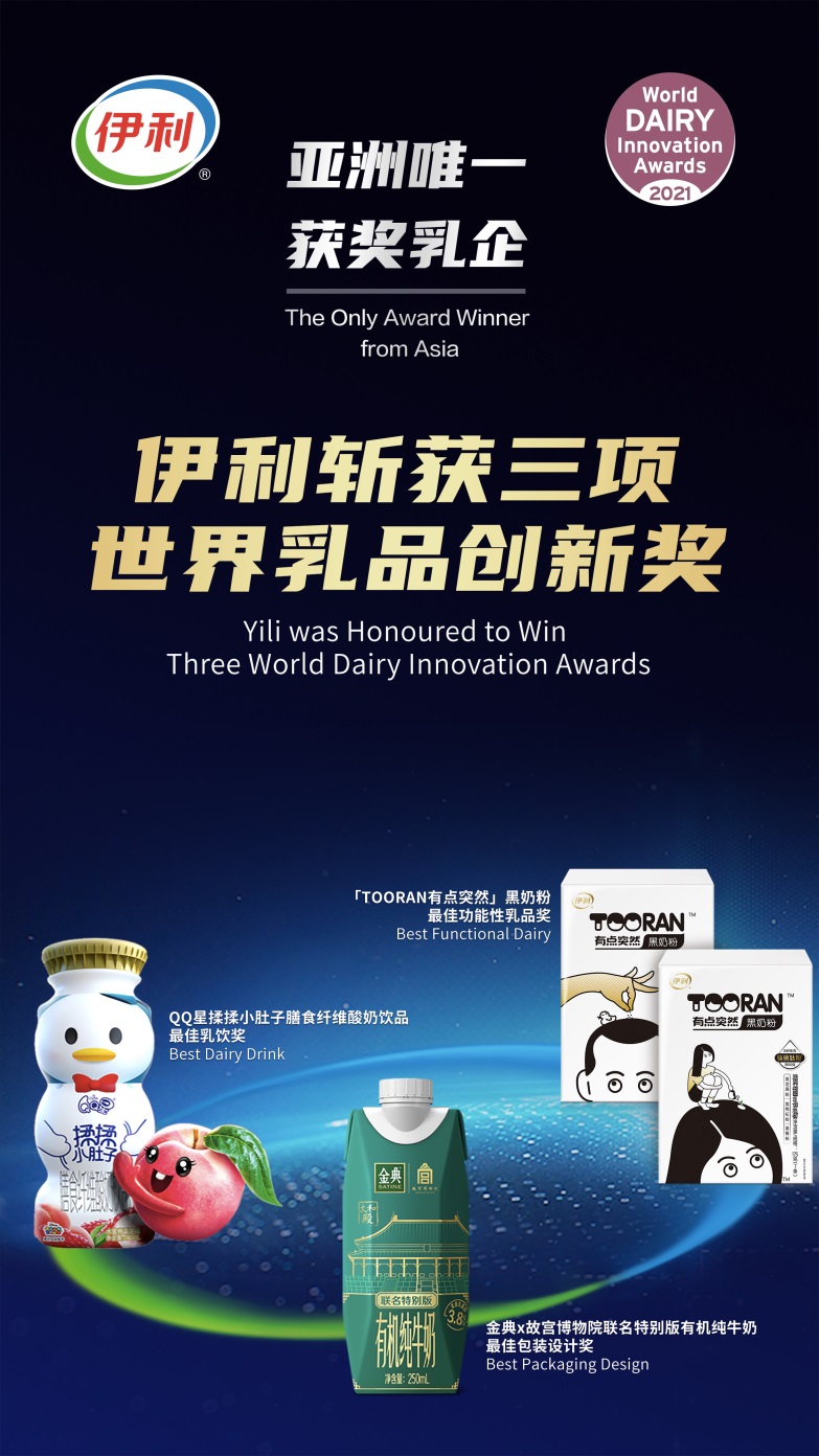 作為全球乳業(yè)的創(chuàng)新風(fēng)向標(biāo),世界乳品創(chuàng)新獎(jiǎng)?wù)故玖巳蛉槠笤趧?chuàng)新方面取得的重要成果,本屆共有來自25個(gè)國家、20個(gè)類別的222個(gè)作品參賽。憑借領(lǐng)先的創(chuàng)新實(shí)力,伊利旗下產(chǎn)品獲得三項(xiàng)大獎(jiǎng):QQ星揉揉小肚子膳食纖維酸奶飲品獲得最佳乳飲獎(jiǎng)、「TOORAN有點(diǎn)突然」黑奶粉獲得最佳功能性乳品獎(jiǎng)、金典x故宮博物院聯(lián)名特別版有機(jī)純牛奶獲得最佳包裝設(shè)計(jì)獎(jiǎng)。