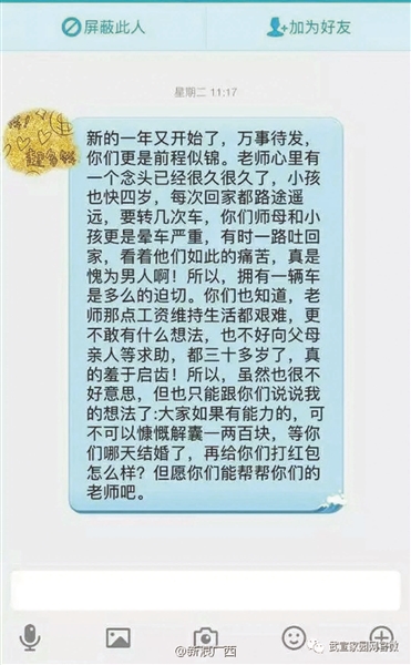 爆料帖中同時(shí)上傳了多張聊天記錄,其中一張顯示:“新的一年又開始了,萬(wàn)事待發(fā),你們更是前程似錦。老師心里有個(gè)念頭已經(jīng)很久了,小孩也快四歲了,每次回家都路途遙遠(yuǎn),要轉(zhuǎn)幾次車,你們師母和小孩更是暈車嚴(yán)重,有時(shí)一路吐回家,看看他們?nèi)绱送纯?,真是愧為男人??!所以,擁有一輛車是多么的迫切。你們也知道老師那些工資維持生活都很艱難,更不敢有什么想法,也不好向父母親人求助,都三十多歲了,真的羞于啟齒!所以,雖然也很不好意思,但是也只能跟你們說說我的想法了:大家如果有能力的,可不可以慷慨解囊一兩百塊,等你們哪天結(jié)婚了,再給你們打紅包怎么樣?但愿你們能幫幫你們的老師吧?!?/p>