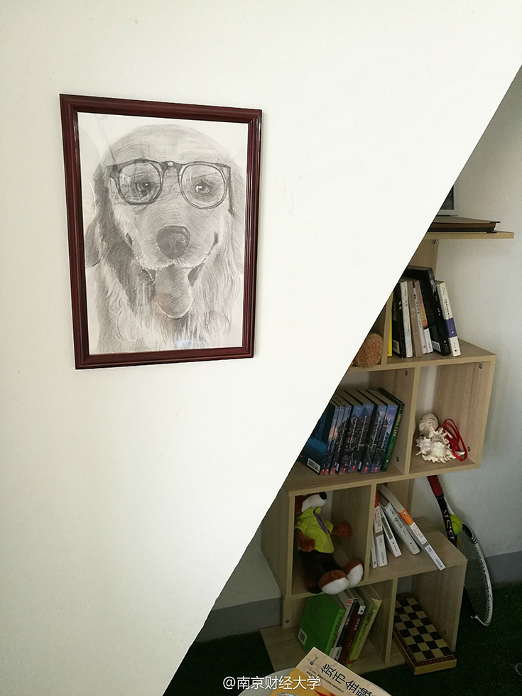 墻上一幅戴著眼鏡的小狗素描圖格外引人注目,它是由602舍長(zhǎng)涂貴平親手畫(huà)的?!斑@幅畫(huà)還是去年自己參加了一個(gè)帶有公益性質(zhì)的畫(huà)畫(huà)班學(xué)的,我也沒(méi)想到能畫(huà)成這樣?!眮?lái)自貴州的涂貴平害羞地說(shuō),其實(shí)裝飾寢室的初衷很簡(jiǎn)單,錢(qián)就花了300塊不到,主要是希望大學(xué)四年能住在干凈的環(huán)境。