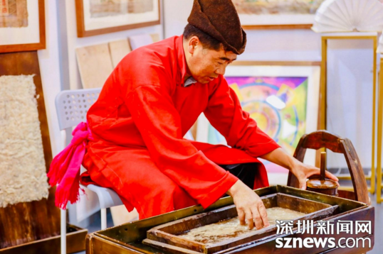 塔城東巴造紙第七代傳承人李學(xué)高在現(xiàn)場(chǎng)持續(xù)“敲、打、洗、晾”的一系列工序,演繹東巴造紙的精湛工藝。東巴紙被稱為“活化石”,是采用納西地區(qū)稀有植物的樹皮制作而成,這些“千年不腐”的東巴紙不僅可用于書寫,添加花瓣、樹枝后的東巴紙燈用作裝飾也非常好看。
