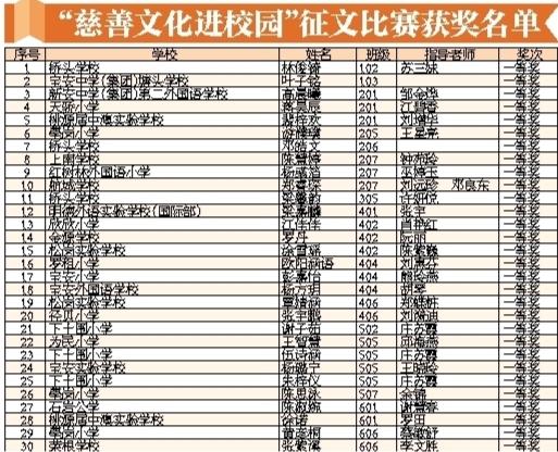 寶安日?qǐng)?bào)2020年1月2日訊 2019年12月31日下午,寶安區(qū)慈善文化進(jìn)校園征文比賽表彰暨2019年度工作總結(jié)會(huì)在寶安實(shí)驗(yàn)學(xué)校會(huì)議室舉行。會(huì)上對(duì)征文比賽獲獎(jiǎng)?wù)吆蛢?yōu)秀組織單位進(jìn)行表彰。學(xué)生代表分享慈善故事,學(xué)校代表則分享慈善文化進(jìn)校園經(jīng)驗(yàn)。此次慈善文化進(jìn)校園征文活動(dòng)是由區(qū)教育局、區(qū)慈善會(huì)、寶安日?qǐng)?bào)社、寶安廣電中心共同主辦,征文主題是“慈善在我身邊”,活動(dòng)在全區(qū)中小學(xué)生中進(jìn)行征集。經(jīng)過(guò)兩個(gè)月的征集和評(píng)比,最終評(píng)出3個(gè)組別的一、二、三等獎(jiǎng)和優(yōu)秀組織單位。