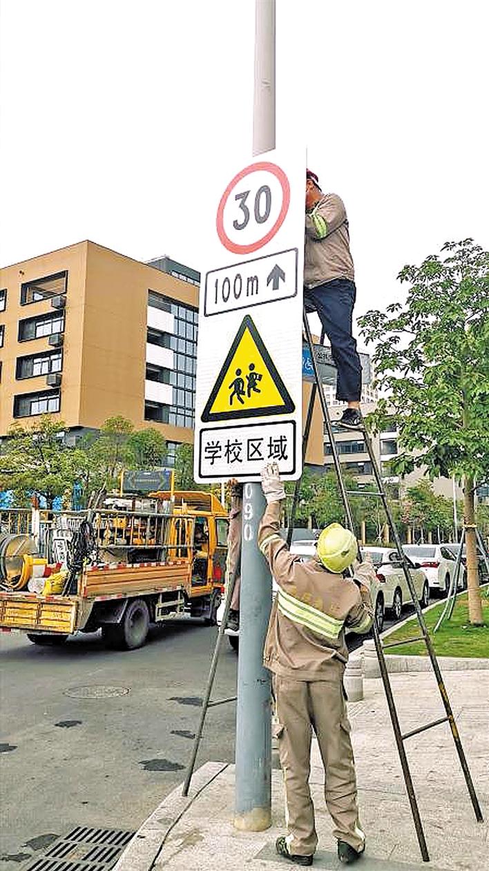 交通設(shè)施維護(hù)工人在龍華區(qū)龍騰學(xué)校周邊道路安裝提示牌。