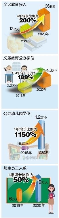 加大教育投入,教育支出增長200%;加快公辦學(xué)校和幼兒園建設(shè),公辦幼兒園從2所增加到31所,公辦園學(xué)位從960個增加到1.2萬個,增長1150%;新建、擴建公辦中小學(xué)12所,義務(wù)教育公辦學(xué)位從2.3萬個增加到4.8萬個,增長104%。短時期內(nèi)實現(xiàn)公辦學(xué)位保障率全市遙遙領(lǐng)先。