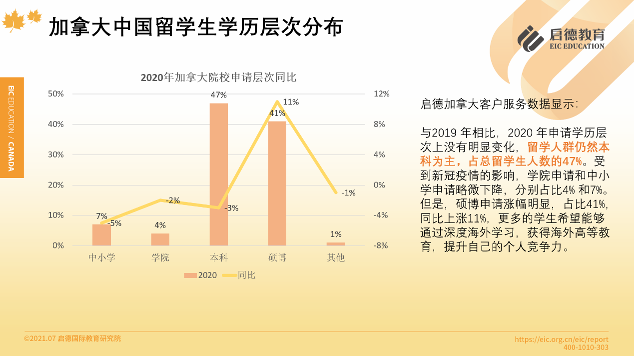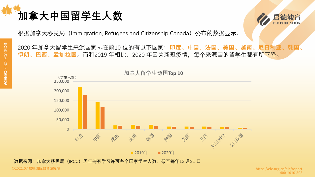 另一組數(shù)據(jù)顯示,2020年中國(guó)內(nèi)地學(xué)生新增人數(shù)最多的三個(gè)省為安大略?。?9.78% )、英屬哥倫比亞省(26.17% )、魁北克?。?.49% )。一方面,安大略省與英屬哥倫比亞省這兩個(gè)省份的教育資源非常豐富,有多所世界知名大學(xué)讓中國(guó)學(xué)生選擇;另一方面,多倫多、溫哥華、渥太華等大城市均在這兩個(gè)省份,工作機(jī)會(huì)多,移民政策也相對(duì)成熟,對(duì)希望留在加拿大發(fā)展的留學(xué)生很具吸引力。