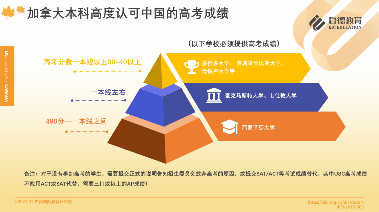 加拿大本科認(rèn)可中國(guó)的高考成績(jī),其中多倫多大學(xué)、英屬哥倫比亞大學(xué)、滑鐵盧大學(xué)等要求高考分?jǐn)?shù)一本線(xiàn)30-40分以上,麥克馬斯特大學(xué)、韋仕敦大學(xué)要求一本線(xiàn)左右,西蒙菲莎大學(xué)要求490分至一本線(xiàn)之間。沒(méi)有參加高考的學(xué)生,需要提交正式的說(shuō)明告知招生委員會(huì)放棄高考的原因,或提交SAT/ACT等考試成績(jī)替代(其中英屬哥倫比亞大學(xué)高考成績(jī)不能用ACT或SAT代替,需要三門(mén)或以上的AP成績(jī))。