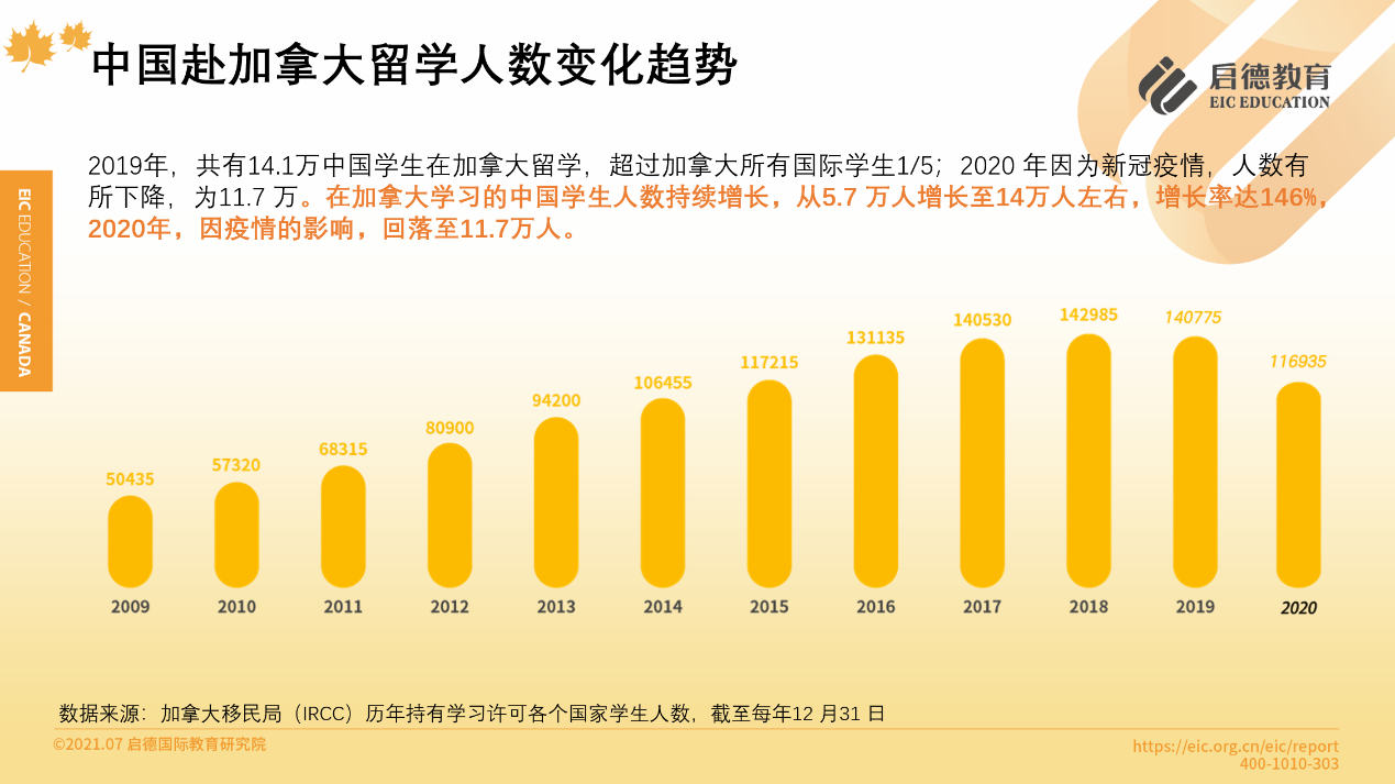 據(jù)加拿大移民局(IRCC)公布的數(shù)據(jù)顯示,2020年加拿大留學(xué)生來(lái)源國(guó)家排在前10位分別是:印度、中國(guó)、法國(guó)、美國(guó)、越南、尼日利亞、韓國(guó)、伊朗、巴西、孟加拉國(guó)。從2010年到2020年的11年間,在加拿大學(xué)習(xí)的中國(guó)學(xué)生人數(shù)持續(xù)增長(zhǎng),從5.7萬(wàn)人增長(zhǎng)至14萬(wàn)人左右,增長(zhǎng)率達(dá)146 %,2020年,因疫情的影響,回落至11.7萬(wàn)人。