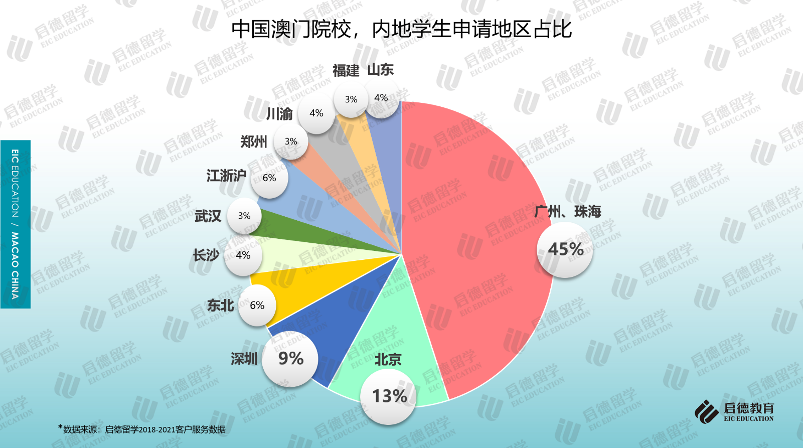 另一組啟德留學(xué)的澳門院校申請(qǐng)人來源數(shù)據(jù)顯示,廣東省廣州、珠海、深圳三個(gè)城市的學(xué)生申請(qǐng)澳門院校的占比超過50%,北京學(xué)生占比13%,分析原因,除了廣東省與澳門在文化上、生活方式上的親近性以及距離較近的優(yōu)勢(shì)外,也與澳門院校對(duì)部分區(qū)域申請(qǐng)人的加分政策有一定關(guān)系。如澳門大學(xué)對(duì)北京市及廣東省高考考籍的學(xué)生有加5分的優(yōu)惠政策,而對(duì)于廣東省珠海市考籍和橫琴戶籍的應(yīng)屆高考生又特別優(yōu)待,實(shí)施15-20分的加分優(yōu)惠政策。