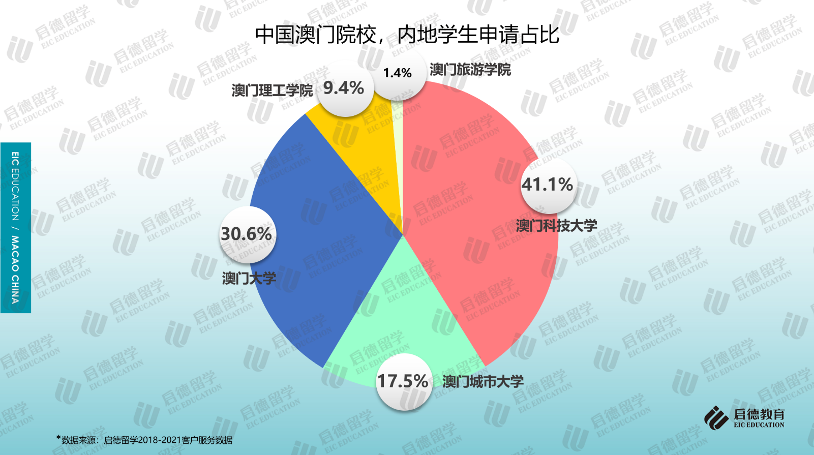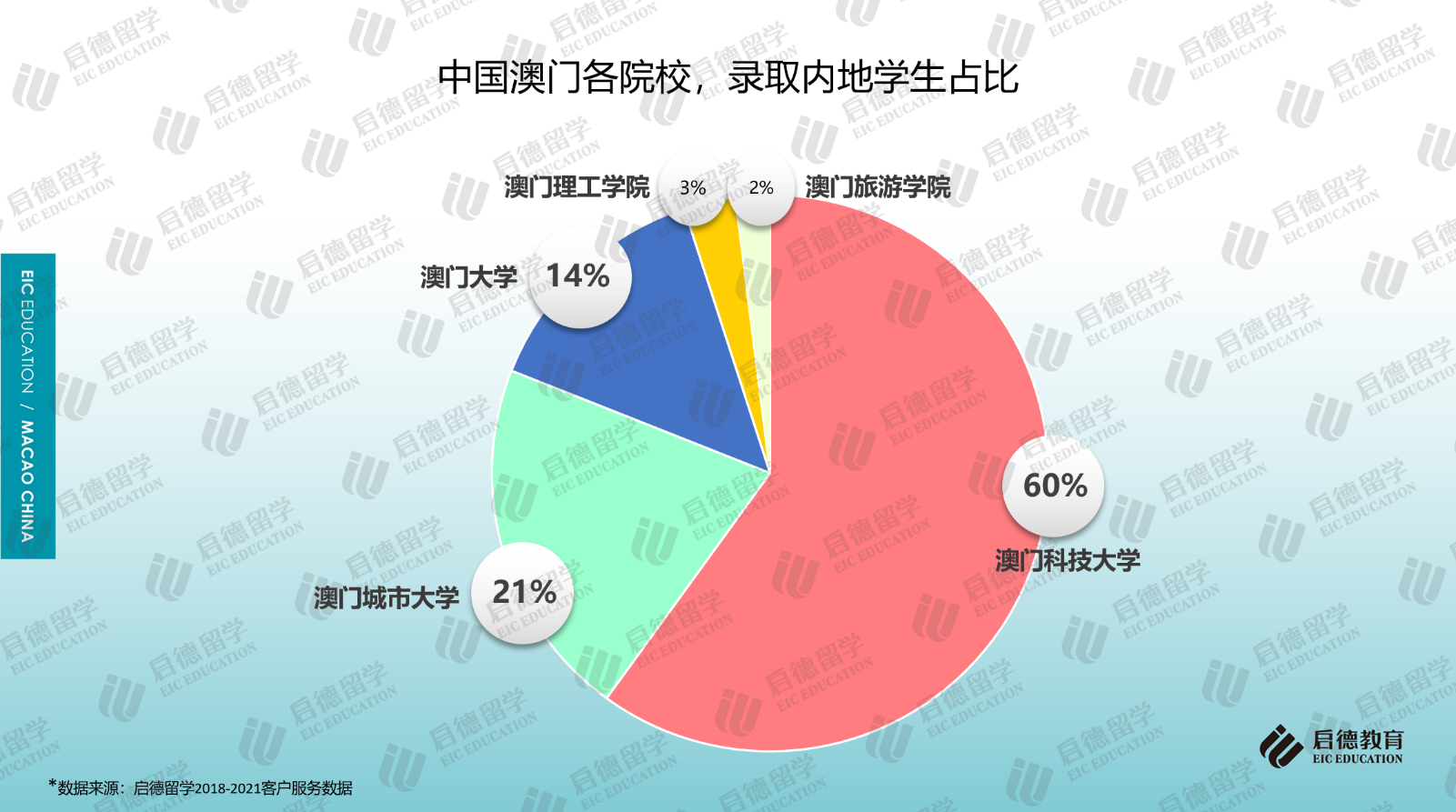 啟德留學(xué)2018-2021客戶服務(wù)數(shù)據(jù)顯示,澳門地區(qū)高校的申請(qǐng)中,七成以上申請(qǐng)澳門科技大學(xué)(41.1%)和澳門大學(xué)(30.6%);作為私立院校的澳門城市大學(xué)因?qū)W科設(shè)置比較全面,申請(qǐng)占比為17.5%;作為公立院校的澳門理工學(xué)院(9.4%)、澳門旅游學(xué)院(1.4%)由于專業(yè)設(shè)置較少,申請(qǐng)占比相對(duì)較少。從啟德留學(xué)澳門地區(qū)高校的錄取數(shù)據(jù)來看,澳門科技大學(xué)的錄取占比為60%,澳門大學(xué)的錄取占比為14%,澳門城市大學(xué)、澳門理工學(xué)院、澳門旅游學(xué)院的錄取占比分別為21%、3%與2%。