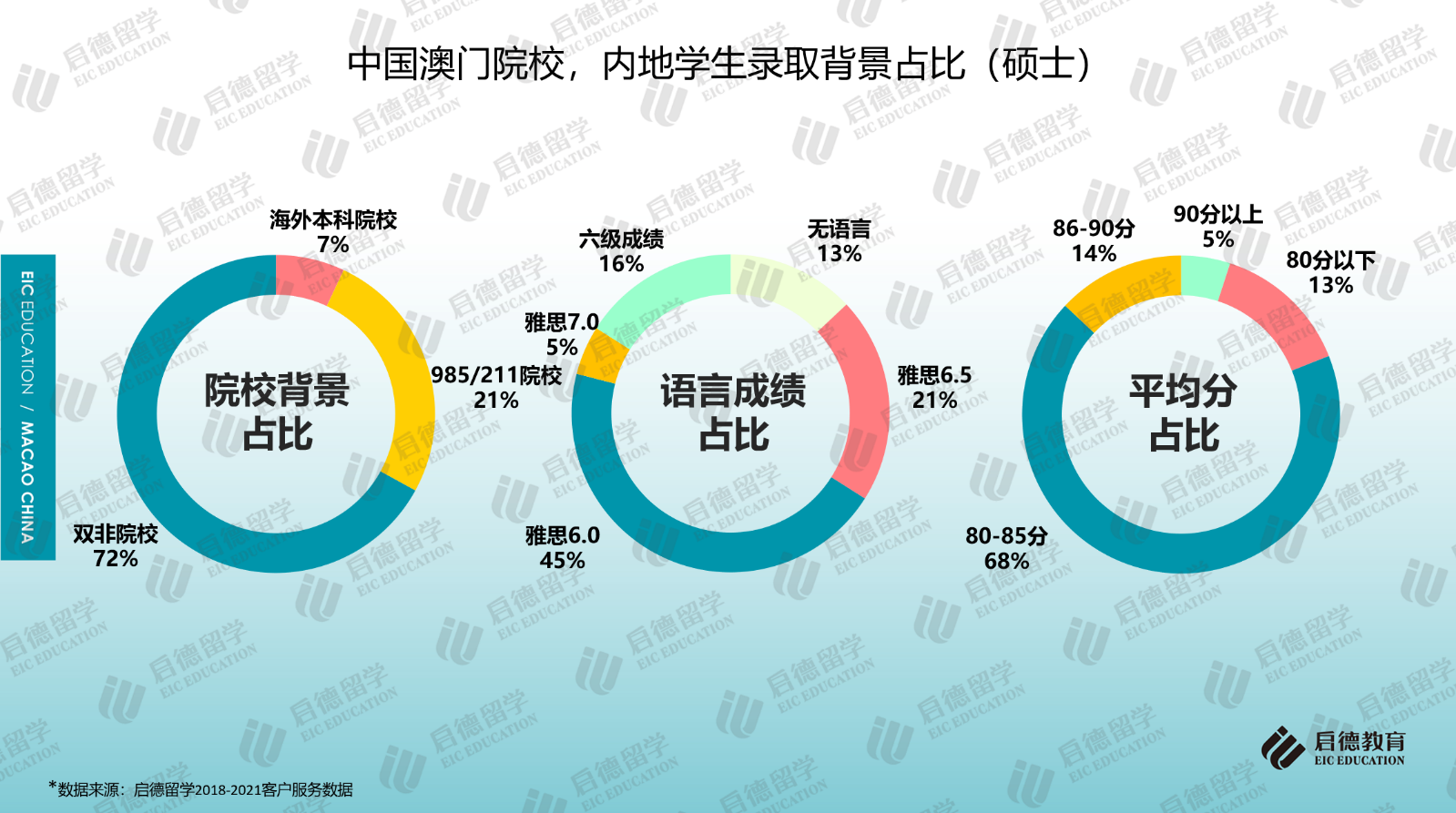 本科錄取中,澳門大學(xué)的要求較高,應(yīng)屆高考生申請(qǐng)人高考成績要達(dá)到一本線;碩士錄取中,只有澳門大學(xué)和澳門旅游學(xué)院要求碩士申請(qǐng)學(xué)生提交英語成績,雅思6分為澳門大學(xué)和澳門旅游學(xué)院的語言門檻要求,澳門大學(xué)碩士申請(qǐng)也可接受430分以上六級(jí)和TEM4/8成績;其它院校的大多數(shù)專業(yè)對(duì)英語成績無硬性要求。啟德留學(xué)2018-2021客戶服務(wù)數(shù)據(jù)顯示,2021年碩士錄取學(xué)生中,45%達(dá)到雅思6分的門檻成績,雅思成績6.5分以上達(dá)到26%,16%的學(xué)生只提供了合格的六級(jí)成績,13%為無語言錄取;七成以上的碩士錄取學(xué)生來自雙非院校;GPA在80分以上的占比為87%。