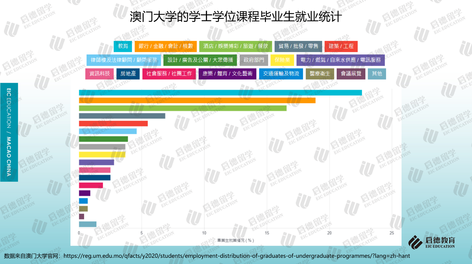 澳門大學(xué)2019/2020年本科畢業(yè)生就業(yè)調(diào)查顯示,畢業(yè)生就業(yè)人數(shù)最多的行業(yè)排名前三位為教育行業(yè)(22.6%)、銀行/金融/會(huì)計(jì)/核數(shù)(18.9%)、酒店/娛樂博彩/旅游/餐飲(16.6%)。澳門科技大學(xué)2018/2019學(xué)年本科畢業(yè)后去向調(diào)查顯示,就業(yè)的本地生中,4.2%選擇在內(nèi)地工作;就業(yè)的非本地生中,在粵港澳大灣區(qū)工作的約占54.3%。本科升學(xué)后去向調(diào)研顯示,除了中國澳門(25.1%)外,英國(31.9%)、澳大利亞(15.8%)、中國香港(7.5%)、美國(5.7%)、新加坡(3.6%)也是主要升學(xué)地區(qū)。