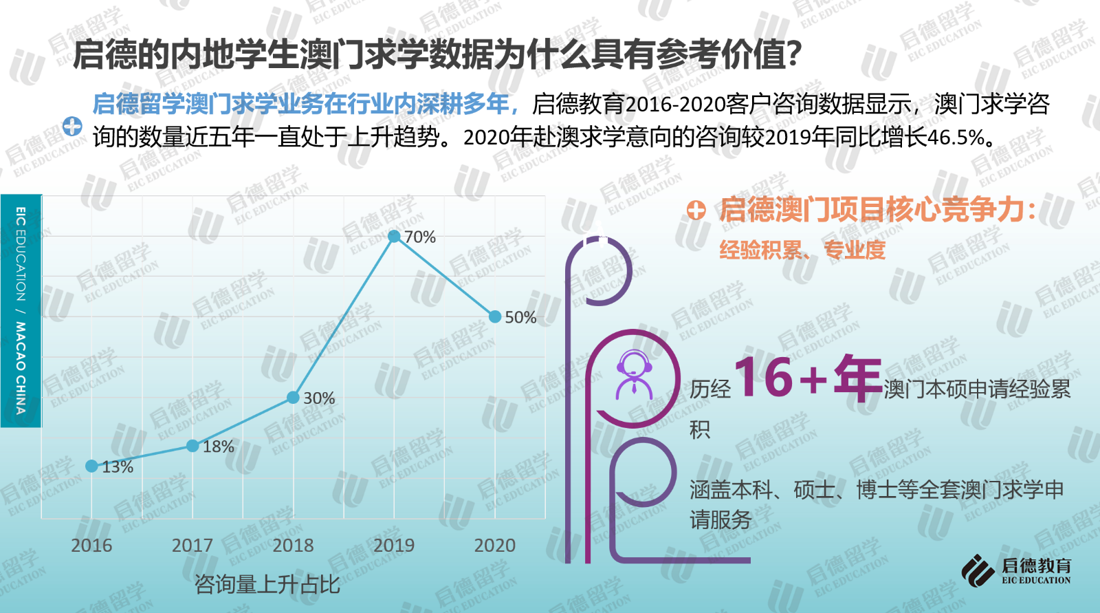 啟德留學(xué)2016-2020客戶服務(wù)數(shù)據(jù)顯示,澳門求學(xué)咨詢量近五年一直處于上升趨勢(shì),2020年咨詢量較2019年同比增長46.5%。2021年10月31日,啟德留學(xué)在北京發(fā)布《2021中國澳門求學(xué)報(bào)告》,這也是行業(yè)內(nèi)首次針對(duì)中國內(nèi)地學(xué)生赴澳門求學(xué)情況進(jìn)行的梳理與分析,《報(bào)告》結(jié)合澳門高校官方數(shù)據(jù)及最近四年啟德學(xué)生澳門求學(xué)申請(qǐng)與錄取數(shù)據(jù),重點(diǎn)分析了澳門求學(xué)的申請(qǐng)要求與錄取趨勢(shì)、澳門六大高校的特色與優(yōu)勢(shì)專業(yè)、澳門本地就業(yè)情況,并就赴澳門求學(xué)規(guī)劃、申請(qǐng)準(zhǔn)備及求職就業(yè)等方面提供了建議。