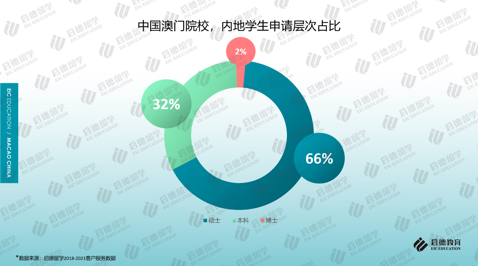 啟德留學(xué)2018-2021客戶服務(wù)數(shù)據(jù)顯示,前往澳門求學(xué)的內(nèi)地學(xué)生選擇攻讀碩士的比例較高,且申請(qǐng)量呈現(xiàn)逐年小幅上升的趨勢(shì),2021年為66%;攻讀本科的占比超過30%,除高考生外,今年也開始有參加國際考試的內(nèi)地學(xué)生申請(qǐng)澳門的高校。QS官網(wǎng)2021年數(shù)據(jù)顯示,澳門大學(xué)非本地生(3921人)中研究生與本科生的占比分別為55%與45%;澳門科技大學(xué)非本地生(8869人)中,研究生與本科生的占比分別為32%與68%。
