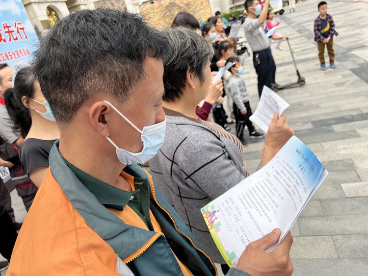居民認(rèn)真閱讀“一盔一帶”交通安全宣傳材料