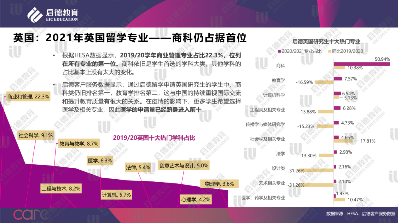 長期以來,由于其廣闊的就業(yè)前景,F(xiàn)AME專業(yè)(金融、會計、管理、經(jīng)濟)和STEM專業(yè)(科學(xué)、技術(shù)、工程和數(shù)學(xué))一直備受留學(xué)生的青睞。2021 《美國門戶開放報告》數(shù)據(jù)顯示,半數(shù)以上的中國內(nèi)地學(xué)生就讀STEM專業(yè)(物理/自然科學(xué)、工程學(xué)、醫(yī)療健康、數(shù)學(xué) /計算機 ),16.6%就讀商業(yè)與管理專業(yè)。英國高等教育統(tǒng)計局 HESA數(shù)據(jù)顯示,2019/20學(xué)年商業(yè)管理專業(yè)占比為22.3%,位列在英國研究生專業(yè)的第一位,其他依次為:社會科學(xué)、教育與教學(xué)、工程與技術(shù)、醫(yī)學(xué)、計算機、法律、創(chuàng)意藝術(shù)與設(shè)計、心理學(xué)以及物理學(xué)。