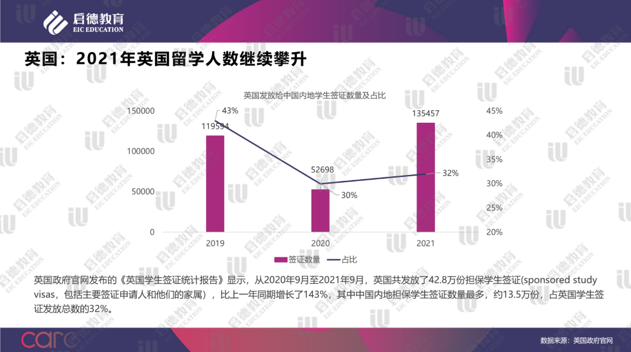 英國政府官網(wǎng)發(fā)布的《英國學(xué)生簽證統(tǒng)計報告》顯示,從2020年9月至2021年9月,英國共發(fā)放了42.8萬份擔(dān)保學(xué)生簽證(sponsored study visas,包括主要簽證申請人和他們的家屬),比上一年同期增長了143%,其中中國內(nèi)地擔(dān)保學(xué)生簽證數(shù)量最多,約13.5萬份,占英國學(xué)生簽證發(fā)放總數(shù)的32%。