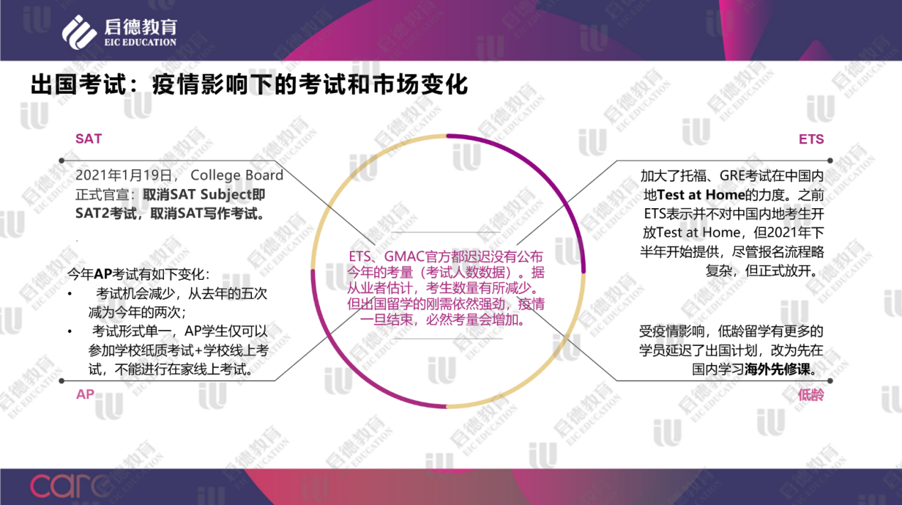 與此同時,國產(chǎn)疫苗被海外多國認可。此外,各種跡象表明,作為最主要的留學(xué)語言,2021年英語考試認證已放寬,考點也在增多。除了日本37所知名院校開展全英文授課外,韓國也可用英語成績遞交申請,法國提供1700個左右的英文授課課程,荷蘭碩士英語授課覆蓋率為95%,英語普及率在全世界非英語母語國家中最高。2021年1月19日,College Board正式宣布取消SAT Subject即SAT2考試,取消SAT寫作考試。2021年下半年 ETS對中國內(nèi)地考生開放Test at Home。同年,BC也在加快在中國內(nèi)地的雅思機考考點建設(shè)速度,計劃2022年將雅思機考考點覆蓋內(nèi)地四十多個城市。