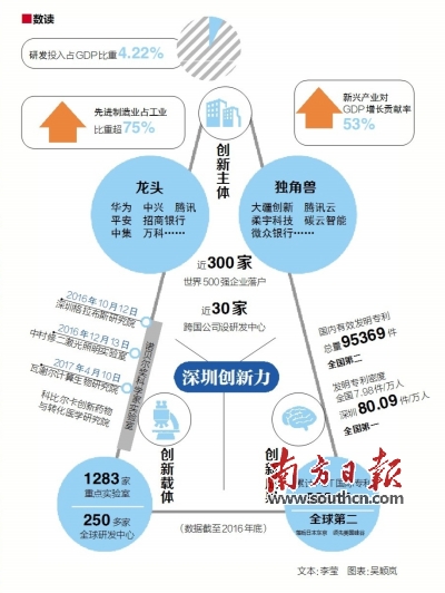 其一,企業(yè)主導(dǎo),政府給力。在整個創(chuàng)新體系中,企業(yè)是技術(shù)創(chuàng)新主體,代表著市場取向;政府是制度創(chuàng)新的主體,主要任務(wù)是營造良好的創(chuàng)新環(huán)境,彌補市場失靈的不足。只有處理好政府和市場的關(guān)系,才能推動整個創(chuàng)新體系不斷完善。因此,深圳一方面讓企業(yè)唱主角,支持企業(yè)創(chuàng)新創(chuàng)業(yè),華為、中興、騰訊、比亞迪等“龍頭”企業(yè)持續(xù)做大做強,大疆創(chuàng)新、光啟、柔宇科技等“獨角獸”企業(yè)迅速發(fā)展;另一方面,政府從政策和規(guī)劃層面加強創(chuàng)新體系頂層設(shè)計,圍繞科技管理機制創(chuàng)新、創(chuàng)業(yè)創(chuàng)新能力提升、強化對外合作等方面構(gòu)建政策支持體系,以企業(yè)為創(chuàng)新驅(qū)動核心、以企業(yè)家群體為創(chuàng)新精神內(nèi)核、政策金融人才協(xié)同共生的創(chuàng)新生態(tài)系統(tǒng)加速形成。