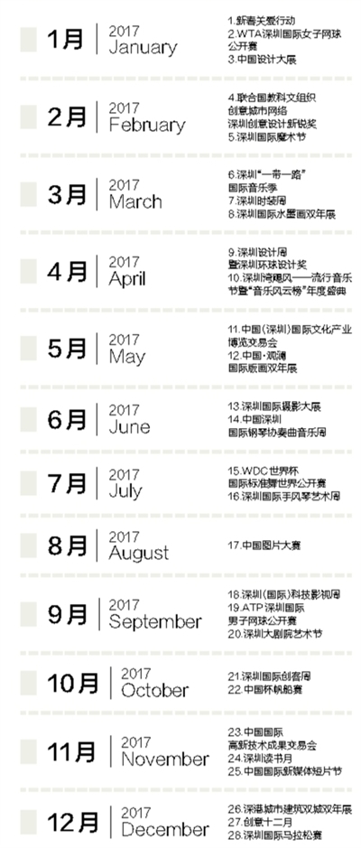 往細(xì)里說(shuō),“城市文化菜單”呈現(xiàn)出鮮明亮點(diǎn):一是國(guó)際化程度高。大部分活動(dòng)都有國(guó)際權(quán)威和國(guó)家級(jí)專業(yè)機(jī)構(gòu)主辦或授權(quán)支持,不少活動(dòng)代表了我國(guó)這一領(lǐng)域的最高水準(zhǔn),是可以代表深圳國(guó)際化城市形象的“文化大餐”。二是內(nèi)容豐富多彩。這份“菜單”表面上看只有28項(xiàng),實(shí)際上每項(xiàng)活動(dòng)時(shí)間跨度從幾天到一個(gè)多月不等,由十?dāng)?shù)項(xiàng)甚至上百項(xiàng)活動(dòng)組成,各款“菜式”都有,不同口味的人都可以自行“看單點(diǎn)菜”。三是體現(xiàn)深圳特色。“菜單”中有三分之一的活動(dòng)與創(chuàng)新創(chuàng)意有關(guān),正好體現(xiàn)了深圳“創(chuàng)新之城”、“設(shè)計(jì)之都”的城市特性,可謂是深圳的文化“特產(chǎn)”。四是新的品牌活動(dòng)首次集體亮相。經(jīng)過(guò)多年培育,深圳已經(jīng)擁有文博會(huì)、高交會(huì)、讀書月、創(chuàng)意12月等傳統(tǒng)品牌活動(dòng),接下來(lái)還要精心打造一系列新的文化品牌活動(dòng)。在這份“菜單”中,2016年及今年新創(chuàng)辦的就有深圳“一帶一路”國(guó)際音樂(lè)季、深圳國(guó)際科技影視周、深圳國(guó)際攝影大展、深圳設(shè)計(jì)周、中國(guó)圖片大賽等多項(xiàng)活動(dòng),文博會(huì)、新春關(guān)愛(ài)行動(dòng)、國(guó)際魔術(shù)節(jié)等老牌活動(dòng)也都將有新的策劃、新的提升,更具國(guó)際化內(nèi)涵。一句話,這份菜單共匯集了國(guó)際化、標(biāo)志性的品牌文化活動(dòng)28項(xiàng),涵蓋文化藝術(shù)、創(chuàng)意設(shè)計(jì)、科技創(chuàng)新、體育休閑等多個(gè)類別,是廣義的文化活動(dòng)的概念。