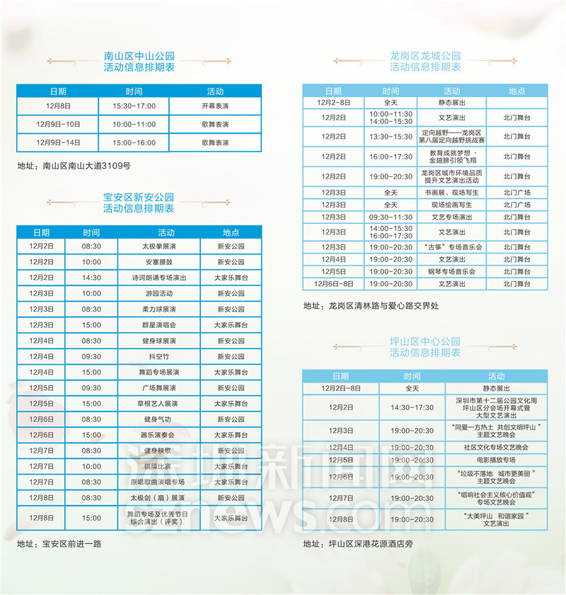 深圳新聞網(wǎng)12月1日訊(記者 鐘鴻冰 通訊員 崔嵩)一年一度的公園文化節(jié)即將到來(lái),12月2日-12月8日,2017年第十二屆公園文化周將在全市27家公園舉行。本屆公園文化周緊密結(jié)合創(chuàng)建“國(guó)家森林城市”和打造“世界著名花城”重點(diǎn)工作,以“美麗深圳 多彩生活”為主題,充分展現(xiàn)美麗宜居的城市環(huán)境及豐富多彩的城市文化生活。
