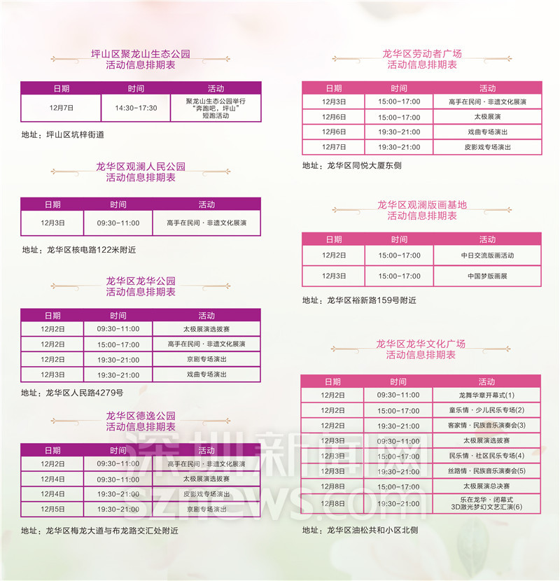 本屆公園文化周共設(shè)27個(gè)會(huì)場(chǎng),其中市屬公園設(shè)11個(gè)會(huì)場(chǎng),區(qū)屬公園設(shè)16個(gè)會(huì)場(chǎng),這也是公園文化周自舉辦以來(lái)承辦會(huì)場(chǎng)最多的一屆。其中,福田區(qū)首次參與公園文化周,該區(qū)紅樹(shù)林生態(tài)公園以及今年新開(kāi)放的香蜜公園均參與了本次活動(dòng)。此外,坪山區(qū)的聚龍山生態(tài)公園,龍華區(qū)的龍華人民廣場(chǎng)、觀瀾人民公園、龍華公園、德逸公園、勞動(dòng)者廣場(chǎng)均是首次參與“公園文化周”的承辦,讓更多市民在家旁邊就感受到公園文化和公園的建設(shè)成果。