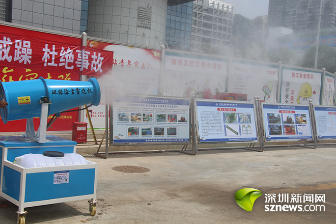 施工單位還在圍擋四周、豎井入口、基坑周邊、隧道掌子面等施工區(qū)域設置全方位的水幕降塵系統(tǒng),可有效控制和治理地面及空中揚塵,改善工地周邊空氣質(zhì)量。此外,該工地采用高強噴霧機,利用不同形狀和霧化角度的噴嘴將水霧化,與粉塵凝聚沉積下來,達到消除粉塵、凈化空氣的效果。