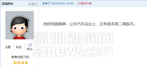 就此,網(wǎng)友“香滿樓”吐槽相關(guān)部門只管建設(shè),不管維護(hù)保養(yǎng)。網(wǎng)友“深圳西站”同時(shí)反映,深圳公共汽車站臺(tái)上,還有很多地鐵路線圖是二期版本。