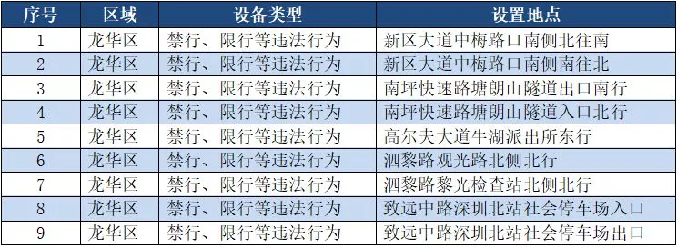 另外,重點(diǎn)整治機(jī)動車禁行、限行等多種違法行為的交通技術(shù)監(jiān)控設(shè)備,深圳交警公布啟用87套。涉及福田區(qū)、羅湖區(qū)、南山區(qū)、寶安區(qū)、龍崗區(qū)、龍華區(qū)、光明新區(qū)、坪山區(qū)、大鵬新區(qū)等9個(gè)區(qū)域。