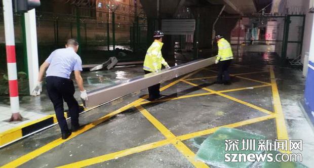 皇崗邊檢站五、六隊的執(zhí)勤民警依舊在室外執(zhí)行監(jiān)護(hù)任務(wù),大風(fēng)把他們的身體吹彎了。更危險的時刻來臨,狂風(fēng)將玻璃窗吹倒,玻璃渣碎落一地,執(zhí)勤民警第一時間上前清理,保障車輛通行安全,直到隱患排除后才發(fā)現(xiàn)雙手早已被細(xì)碎的玻璃劃得鮮血直流。