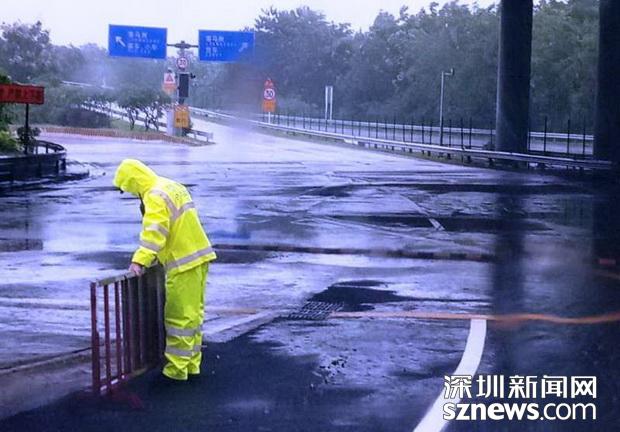 邊檢民警冒雨在強(qiáng)臺風(fēng)中固定好引導(dǎo)分流鐵馬