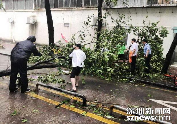 邊檢民警冒雨在執(zhí)勤現(xiàn)場搬挪被強(qiáng)臺(tái)風(fēng)刮倒的樹枝