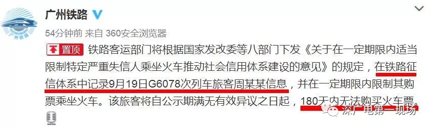 據(jù)@廣州鐵路今天上午10點25分通報稱,鐵路客運部門將根據(jù)國家發(fā)改委等八部門下發(fā)《關(guān)于在一定期限內(nèi)適當(dāng)限制特定嚴(yán)重失信人乘坐火車推動社會信用體系建設(shè)的意見》的規(guī)定,在鐵路征信體系中記錄9月19日G6078次列車旅客周某某信息,并在一定期限內(nèi)限制其購票乘坐火車。