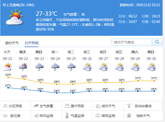 深圳市氣象臺提醒,21日深圳天氣炎熱,請注意做好防暑降溫;部分時間有輕微灰霾,建議根據(jù)灰霾條件合理安排戶外活動。此外,中秋假期出行或有陣雨,注意攜帶雨具。