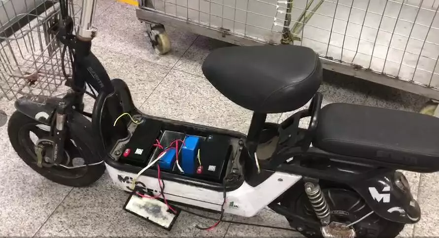 “當時看到這名旅客電單車的腳踏板位置比車身其他位置要干凈一些、新一些,就進行了檢查。檢查發(fā)現(xiàn)腳踏板可以直接掀起來,里面的電池盒外表也比較新,這就不太正常了。”現(xiàn)場關(guān)員介紹道。隨后,關(guān)員對電動單車電池盒進行了拆卸。