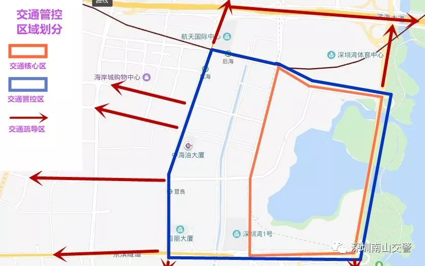 交通管理區(qū)外圍相應的濱海大道、科苑南路(濱海以北段)、沙河西路(濱海以北段)、海德三道(后海濱以西段)、登良路(后海濱以西段)、創(chuàng)業(yè)路(后海濱以西段)、后海濱路、望海路等道路。