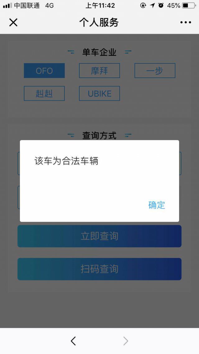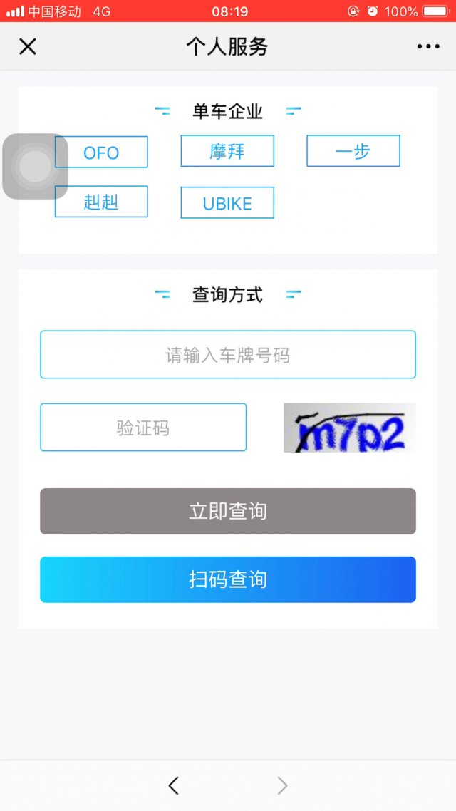 提交完手機(jī)號(hào)和驗(yàn)證碼之后,我們就來到了這個(gè)頁(yè)面,在這里,你可以選擇你要查詢的共享單車的品牌,品牌選擇完畢后,你可以選擇手動(dòng)輸入車牌號(hào)碼或掃碼查詢!