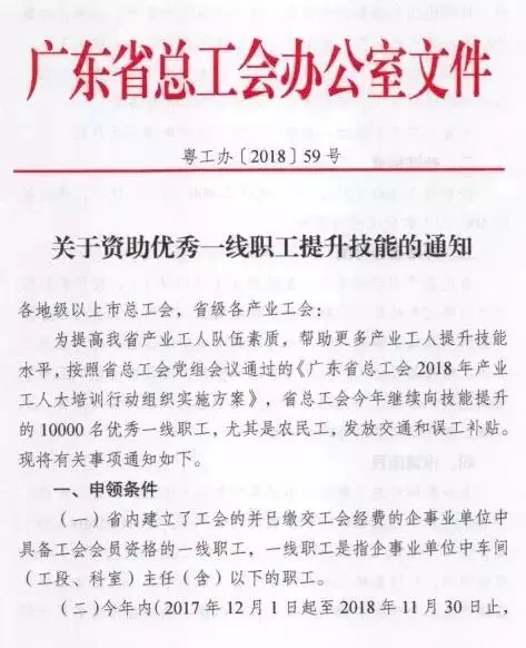 為提高我省產(chǎn)業(yè)工人隊伍素質(zhì),幫助更多產(chǎn)業(yè)工人提升技能水平,按照省總工會黨組會議通過的《廣東省總工會2018年產(chǎn)業(yè)工人大培訓(xùn)行動組織實施方案》,省總工會繼續(xù)向10000名技能提升的優(yōu)秀產(chǎn)業(yè)工人發(fā)放交通和誤工補貼。取得職業(yè)資格證書可獲300~500元補貼,名額有限,先到先得!