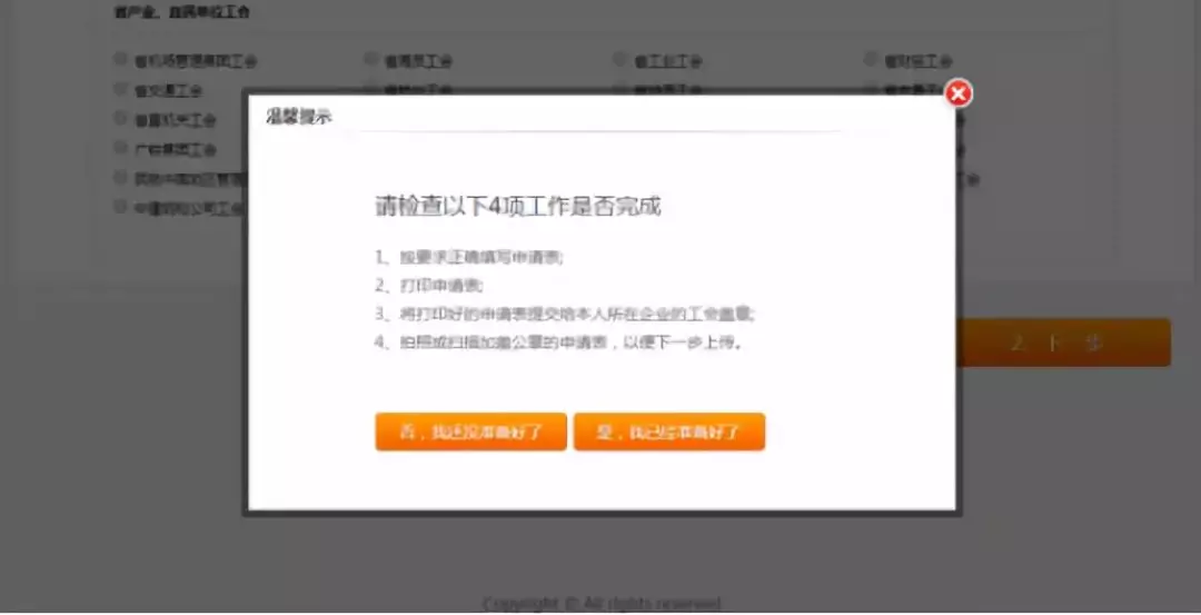 2.根據(jù)“溫馨提示”確認(rèn)是否已完成,如果未完成,點(diǎn)擊【否,我還沒準(zhǔn)備好】,并隨后完成所有工作;如果已完成,點(diǎn)擊【是,我已經(jīng)準(zhǔn)備好了】,進(jìn)入下一個(gè)頁(yè)面。在申報(bào)過(guò)程中,長(zhǎng)時(shí)間在網(wǎng)站頁(yè)面停留,會(huì)遇到頁(yè)面過(guò)期,遇到此問(wèn)題需重新登錄;