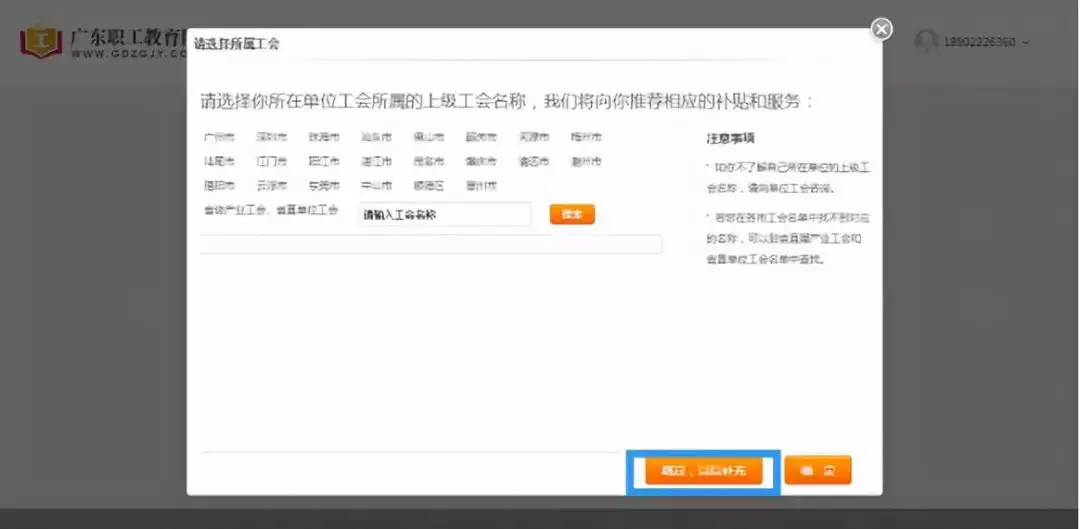 1.進(jìn)入個(gè)人中心頁(yè)面,系統(tǒng)自動(dòng)彈出工會(huì)所屬窗口,選擇所屬工會(huì),如仍未確定所屬工會(huì),可點(diǎn)擊【跳過,以后補(bǔ)充】;如已確定所屬工會(huì),請(qǐng)選擇所屬工會(huì),點(diǎn)擊【確定】;