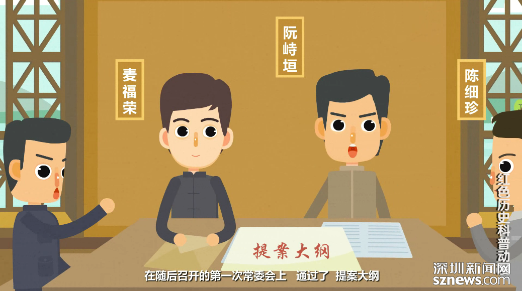 該動畫片圍繞中共寶安縣第一次黨員代表大會作了重點講述。1928年2月23日,根據(jù)廣東省委的指示,中共寶安縣委在燕川素白陳公祠召開第一次黨員代表大會。大會認真總結廣州起義失敗的原因和教訓,克服悲觀主義和盲動主義,建立新的領導核心,選舉產(chǎn)生了中共寶安縣第三屆委員會。在隨后的召開的第一次常委會上,通過了《提案大綱》,決定重新整頓各級黨組織,進一步發(fā)展黨員;加強宣傳工作,創(chuàng)辦農(nóng)民學校、夜校、翻印《紅旗》、《布爾什維克》等黨內(nèi)刊物及各種宣傳品。