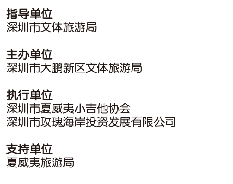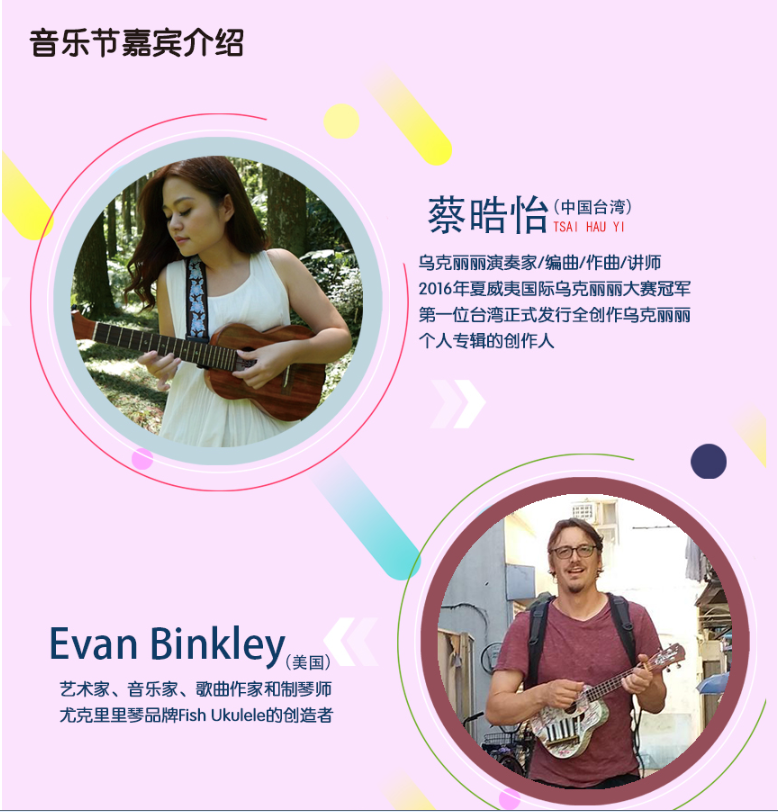其中全民參與嘉年華音樂會11月17日的將會在深圳市玫瑰海岸沙灘舉辦,有深圳、香港(中國)、臺灣(中國)、美國、日本、廣州、中山、珠海等地的嘉賓和愛好者近50組表演者帶來4小時尤克里里盛會,表演者年齡跨度更是從5歲到60歲。嘉年華現(xiàn)場除了尤克里里音樂會,還將有Moana夏威夷呼拉舞風(fēng)情體驗,中國臺灣尤克里里協(xié)會會長陳建廷新書《兒童尤克里里英文暢游》深圳首發(fā),中國臺灣尤克里里世界大賽冠軍蔡皓怡原創(chuàng)專輯《航海日志》深圳首發(fā),以及美國尤克里里音樂家、藝術(shù)家新專輯《粉色海豚》尤克里里專輯中國大陸首發(fā)。