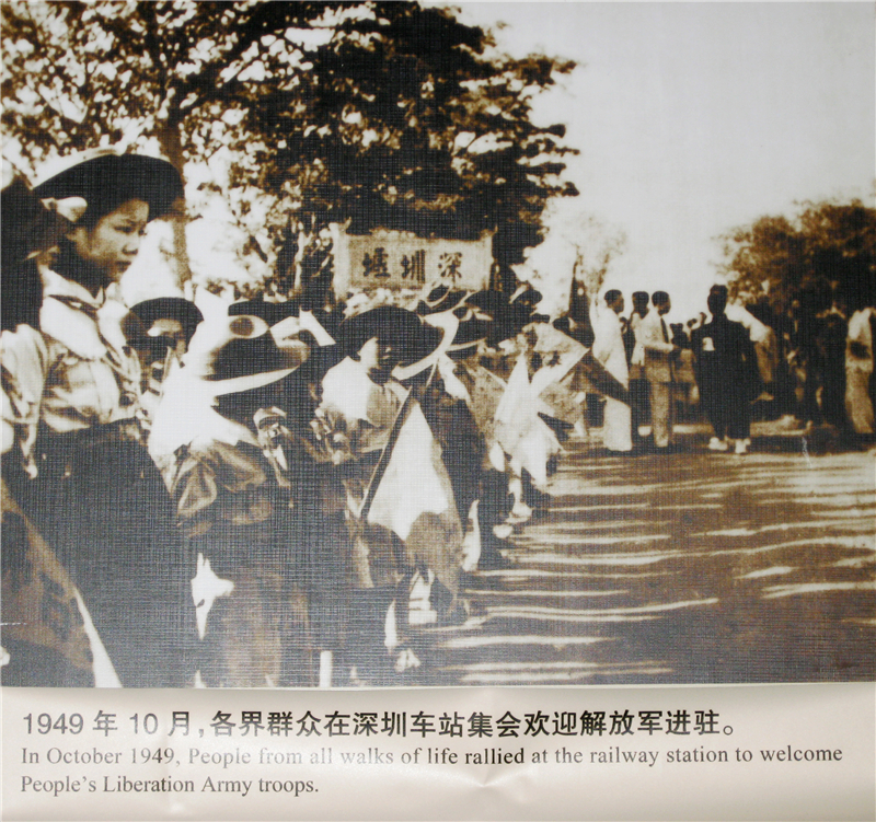 圖為居民在車站歡迎解放軍,背后可清晰地看到當時深圳火車站的站名“深圳墟”