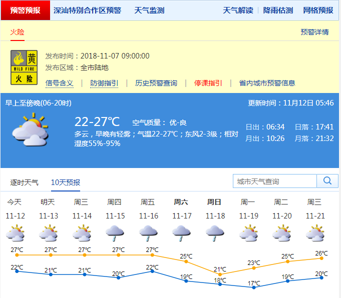 12日陰天間多云,早晚有輕霧和輕微霾,氣溫22-27 ℃;周二(13日)多云,可見陽光,氣溫略升;周三到周六(14-17日)陰天間多云,間中有零星小雨,雨時(shí)能見度較低,氣溫小幅波動(dòng);周日(18日)陰天有短時(shí)小雨,氣溫下降,北風(fēng)加大。