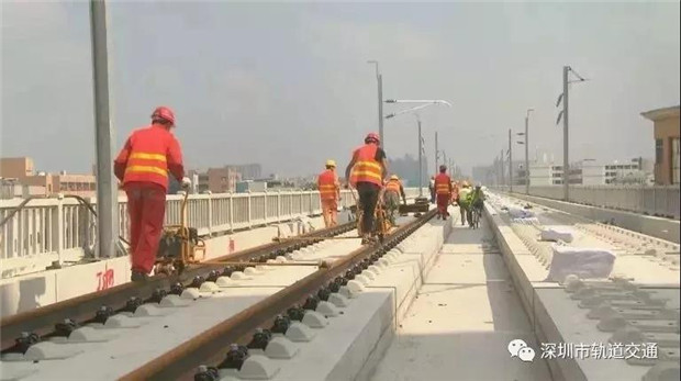 從施工現(xiàn)場可以看到,鋪軌機(jī)把長軌放入無碴道床就位,當(dāng)鋼軌最后精準(zhǔn)就位后,要求正負(fù)誤差不超過1毫米。目前鋪軌進(jìn)度至少每天7公里,11日上午從金沙站開始不停歇作業(yè),到下午兩點鋪軌作業(yè)已臨近深圳。項目建設(shè)者表示,大約本月20號鋪設(shè)到深圳機(jī)場北站。