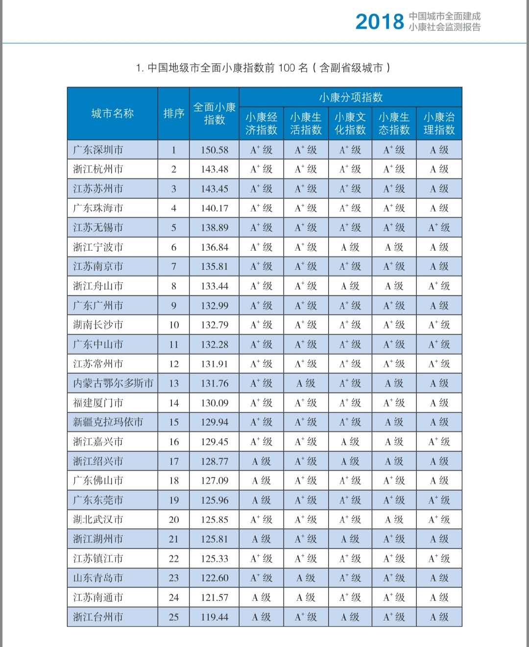 其中,深圳全面小康指數(shù)達150.58分,位列全國地級市(含副省級城市)全面小康指數(shù)前100名榜首。在分項指標中,深圳的小康經濟指數(shù)、小康生活指數(shù)、小康文化指數(shù)、小康生態(tài)指數(shù)均達到A+級,小康治理指數(shù)為A級。