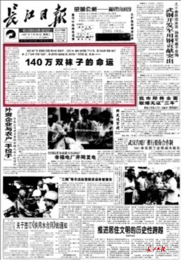 《140萬雙襪子的命運(yùn)》于1997年7月30日首發(fā)于長江日報(bào)一版,獨(dú)家報(bào)道了武漢襪廠倉庫里積存了兩火車皮襪子,其中最長的沉睡了10年,但是面對眾多商家訂單,工廠卻長年不肯“吐貨”,商家開價(jià)越來越低,襪子在一天天貶值。此報(bào)道一出,轟動全國,多家媒體轉(zhuǎn)載,并獲得第八屆中國新聞獎一等獎。