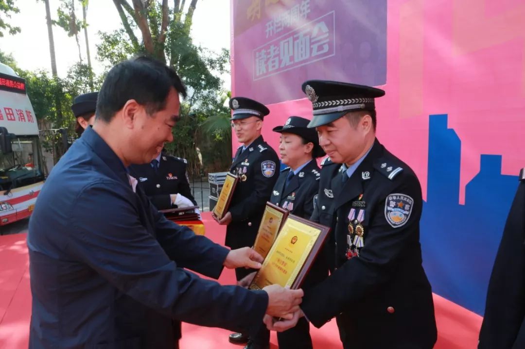 深圳市公安局與深圳特區(qū)報(bào)合辦的“每日警星”專欄讀者粉絲見面會(huì)在福田分局開放點(diǎn)火熱開展,來自深圳警隊(duì)刑偵、掃黑攻堅(jiān)、治安、社區(qū)、特警、交警、預(yù)審等各個(gè)崗位的14名“每日警星”代表現(xiàn)場激情合唱中國人民警察警歌;徐文海與深圳報(bào)業(yè)集團(tuán)黨組副書記、副社長、總編輯周斌共同為“每日警星”代表頒發(fā)紀(jì)念牌。