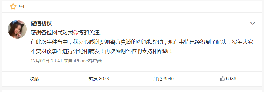 9日晚,網(wǎng)友“微信初秋”再次發(fā)文表示:事情已經(jīng)得到解決,感謝網(wǎng)友關注