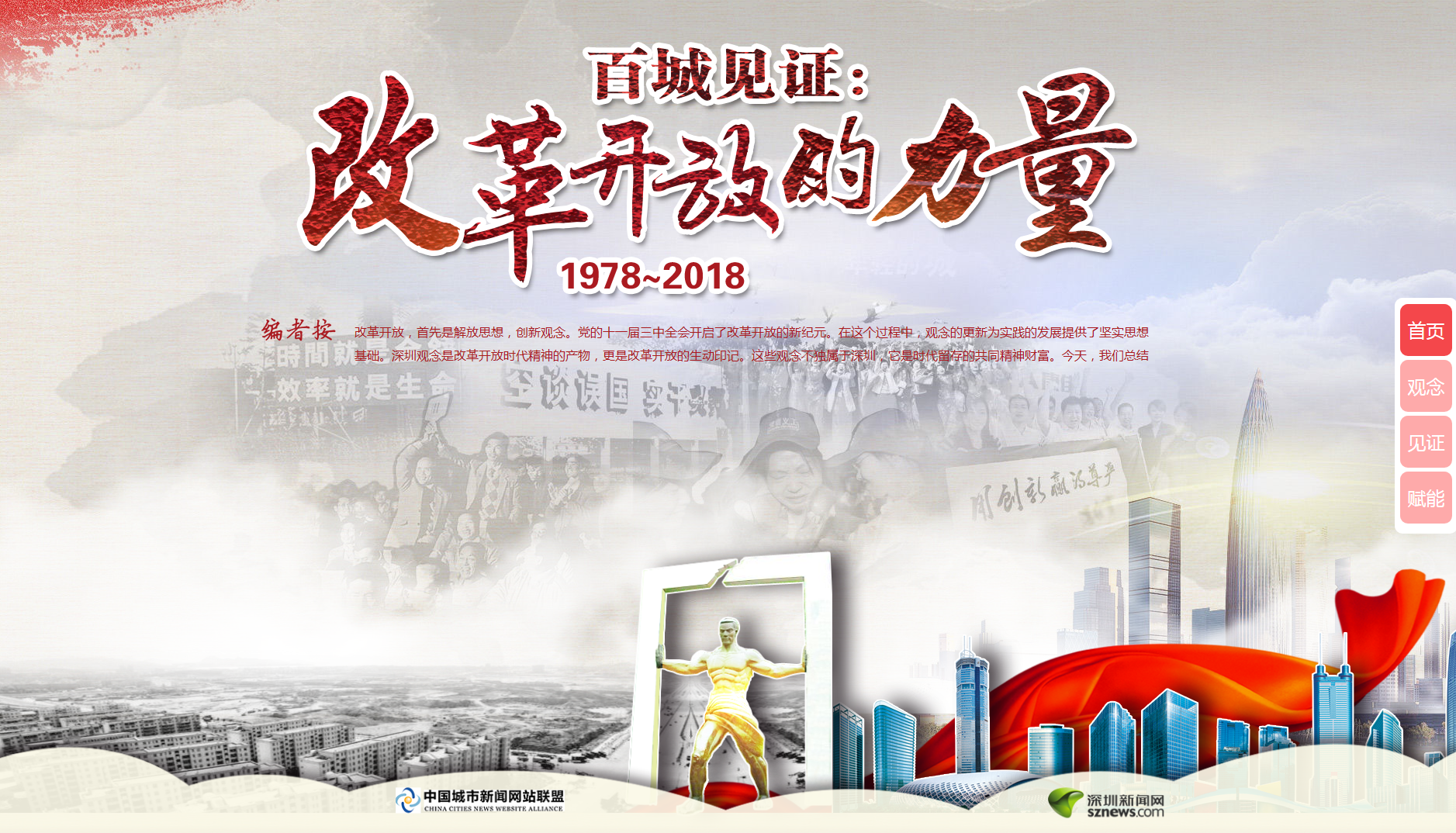 此次活動(dòng)由中國(guó)城市新聞網(wǎng)站聯(lián)盟主辦,深圳新聞網(wǎng)承辦,活動(dòng)在今年10月中國(guó)城市新聞網(wǎng)站聯(lián)盟總編輯聯(lián)席會(huì)上正式啟動(dòng)。專題網(wǎng)頁采用全新H5技術(shù),用歷史原圖、視頻、音頻和文字交互呈現(xiàn)方式,詮釋改革、實(shí)干、擔(dān)當(dāng)、文明、開放、創(chuàng)新等深入民心的改革開放觀念,并發(fā)動(dòng)網(wǎng)盟近百家成員單位網(wǎng)站,深入挖掘當(dāng)?shù)爻鞘懈母镩_放的生動(dòng)案例和故事,報(bào)道這些代表性觀念對(duì)所在城市發(fā)展的巨大影響,共同描繪改革開放40年的生動(dòng)畫卷。