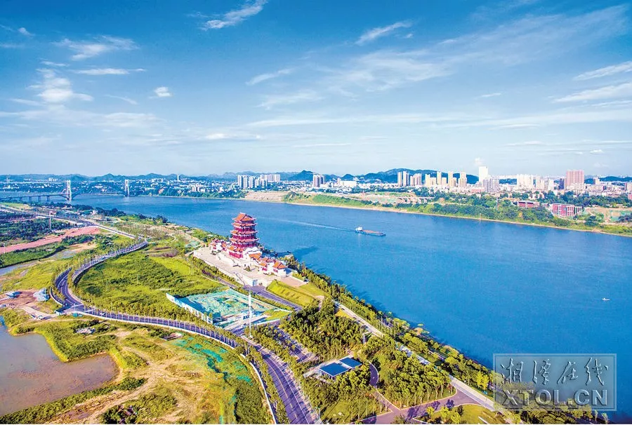 藍天白天映襯下的湘江湘潭段,江水清澈。(記者 方陽 攝)