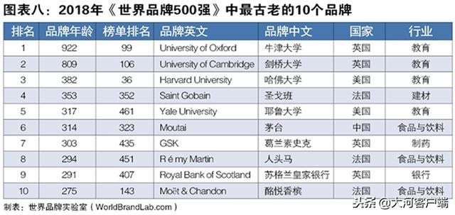 2018年度《世界品牌500強(qiáng)》的平均年齡達(dá)到100.14歲,相比去年的100.19歲略有下降。其中100歲及以上的“百年老牌”多達(dá)213個(gè),美國以92個(gè)占比達(dá)到4成。英國的兩所知名學(xué)府牛津、劍橋分別列為最古老品牌的前兩名。學(xué)校的歷史積淀是知識(shí)的沉淀感的最佳表象。除去擁有悠久歷史的著名大學(xué)之外,法國的老牌公司圣戈班Saint Gobain(353歲)是企業(yè)界擁有最長歷史的品牌。中國入選的38個(gè)品牌中只有茅臺(tái)、青島啤酒、五糧液、中國銀行超越百齡。依行業(yè)來看,食品與飲料類品牌最古老,100歲以上的入選品牌占到了27個(gè)。